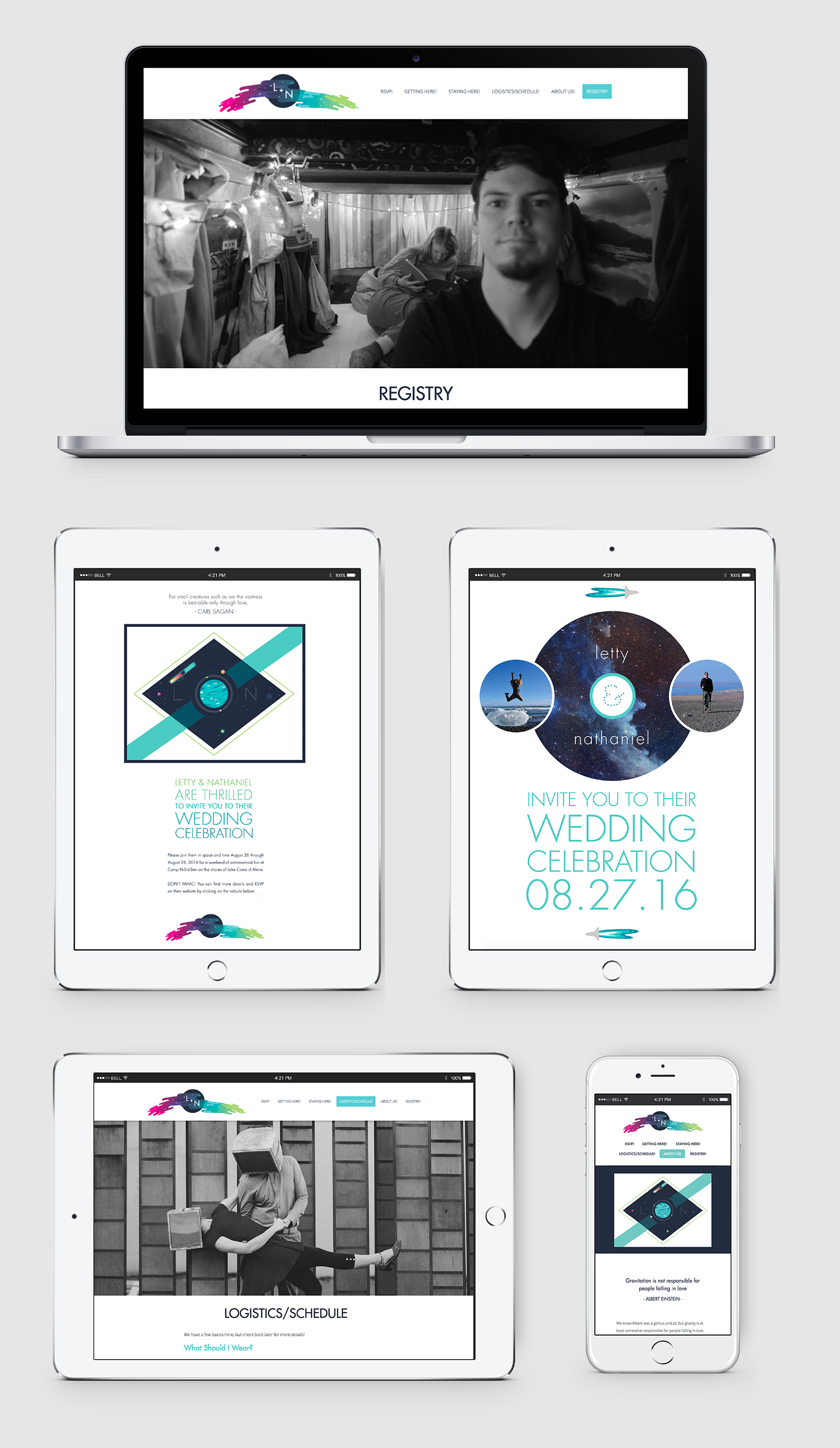 I got married in August of 2016 and designed a number of different aspects of our wedding - the invites, the website, the associated print pieces, and the centerpieces. The theme of our wedding was astronomical!